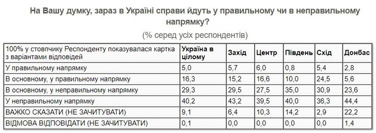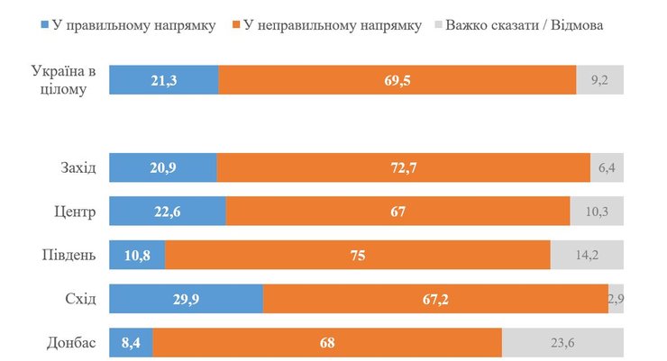По результатам всеукраинского исследования КМИС, проводившегося с 8 по 15 октября, цифра недовольных курсом Украины отличается в разных частях страны, одинаково всех без исключений регионах большинство респондентов уверены, что он неправильный. В том, что дела у страны развиваются в правильном направлении уверены только 21,3% респондентов.