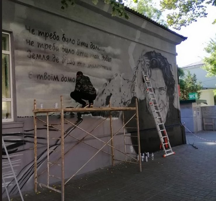 На мурале изображен портрет Кузьмы и слова из его песни "Шукав свій дім":