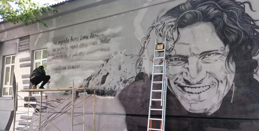 На мурале изображен портрет Кузьмы, подписанный словами из его песни "Шукав свій дім".