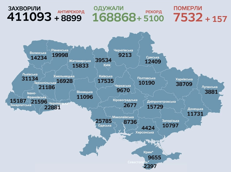 За все время пандемии в Украине: заболели 411 093 человека; выздоровели 168 868 человек; летальных исходов 7 532; проведения ПЦР-тестов 3 379 029.