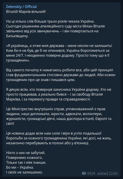 "Виталий Маркив свободен! Этих нескольких слов более трех лет ждала Украина", – написал Зеленский, отметив, что за Маркива боролись Министерство внутренних дел, уполномоченный по правам человека, украинский дипломатический корпус, юристы, адвокаты, волонтеры, журналисты, а также общественные деятели, "и наша диаспора в Италии, Европе и во всем мире".