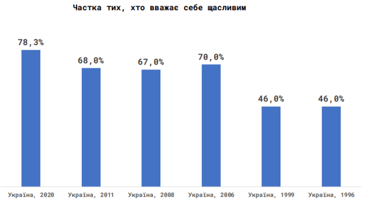 За последние 25 лет самооценка ощущения счастья украинцев выросла с 46% до 78%.