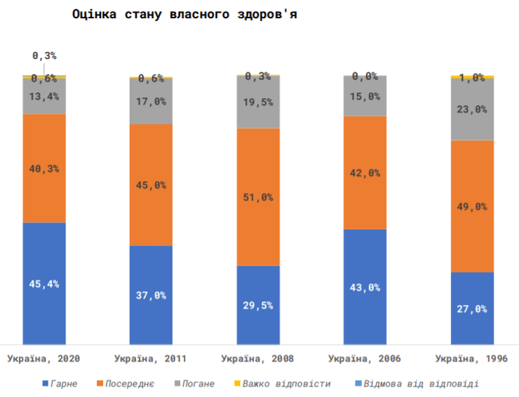 В 2020 году среди украинцев зафиксировано наибольшее количество тех, кто оценил свое здоровье как "очень хорошее" и "хорошее" – 45,4%. Наименьшее количество респондентов, которые оценивали положительно состояние своего здоровья, было отмечено в 1996 и 2008 годах – 27% и 29,5% соответственно.
