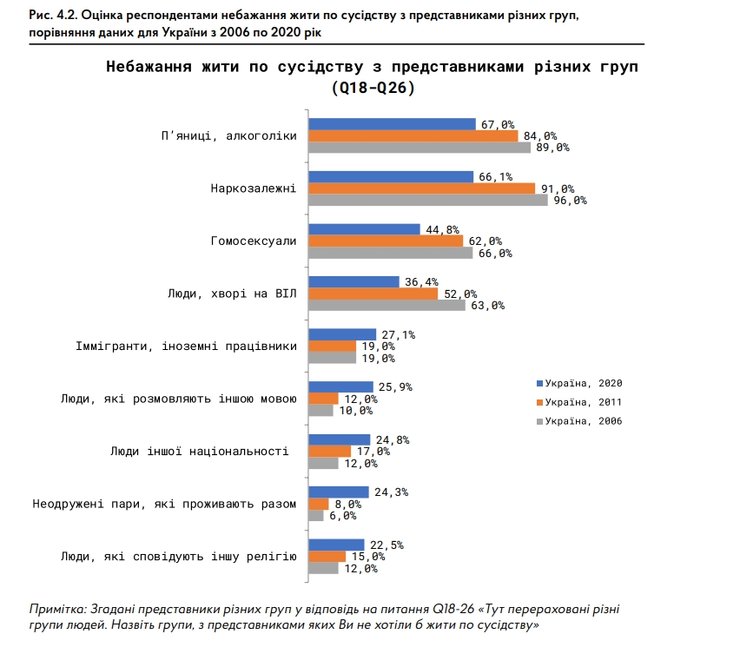 Наименее приемлемыми соседями для украинцев в 2020 году стали алкоголики. 67% опрошенных ответили, что не хотели бы жить с представителями этой группы. Для 66,1% нежелательными соседями являются наркозависимые, а для 44,8% — гомосексуалы. Таковы результаты опроса "Мировое исследования ценностей" ("WVS").