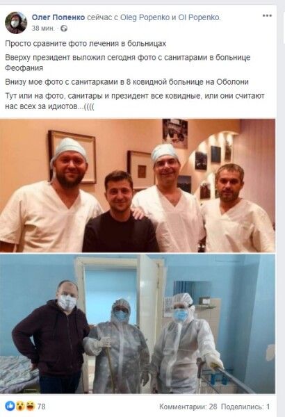 "Просто сравните фото лечения в больницах. Вверху президент выложил сегодня фото с санитарами в больнице Феофания. Внизу мое фото с санитарками в 8 ковидной больнице на Оболони. Тут или на фото, санитары и президент все ковидные, или они считают нас всех за идиотов…((((" — написал блогер Олег Попенко. Который, впрочем, затем также скрыл или удалил свою публикацию.