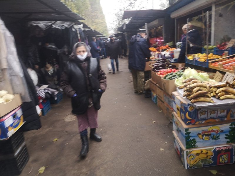 Продуктовый рынок на Борщаговке по улице Зодчих живет отдельной жизнью. Мало того, что работает в полную силу, так еще и людей больше обычного. Среди раскладки помидоров, яблок и мяса продают и вещи, нижнее белье и обувь. Конечно, многие придерживаются правила ношения защитных масок, но говорить хоть о какой-то дистанции между людьми не приходится.