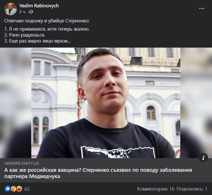 Кроме этого, Стерненко уточнил, что Вадим Рабинович не вакцинирован, в отличие от своего соратника по партии Виктора Медведчука.