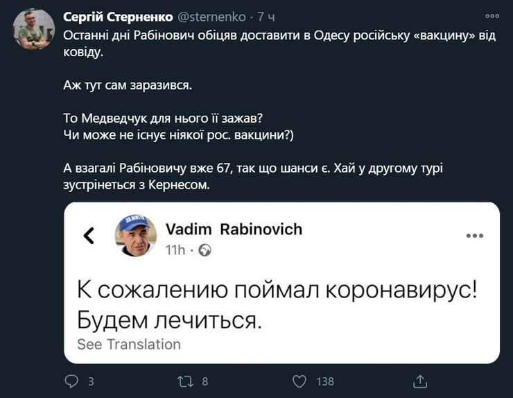 Спустя несколько часов после того, как Рабинович сообщил в сети, что он подхватил коронавирус, Стерненко написал у себя в Twitter, что сопредседатель "ОПЗЖ" находится в группе риска Covid-19 по возрасту:
