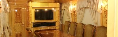Такой вагон вмещает до 11 человек, имеет кухню с холодильником, зал отдыха с компьютером и видеотехникой, а также кровать и ванную комнату, сообщили в "УЗ" в ответ на запрос УНН. Внешне он ничем не отличается от обычного, однако в середине – настоящее барокко: ценное дерево, мозаика и даже позолота.
