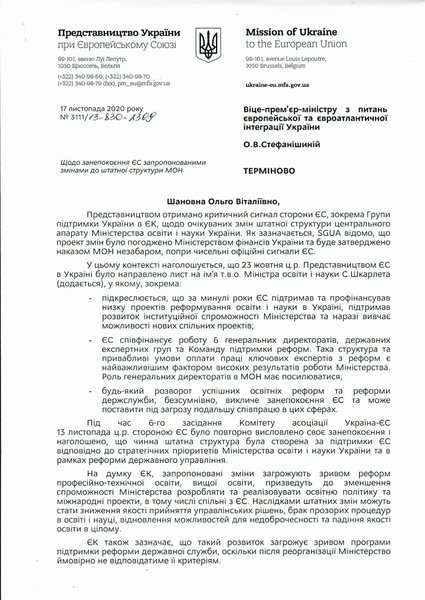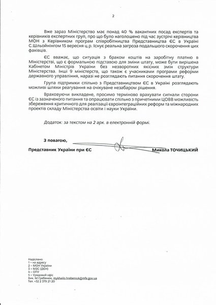 "Представительством получен критический сигнал стороны Евросоюза, в частности от Группы поддержки Украины в Европейской комиссии, по поводу ожидаемых изменений штатной структуры центрального аппарата Минобразования Украины. Группе известно, что проект изменений был согласован Министерством финансов Украины и будет утвержден приказом МОН вскоре, несмотря на многочисленные официальные сигналы ЕС", – сообщается в письме.