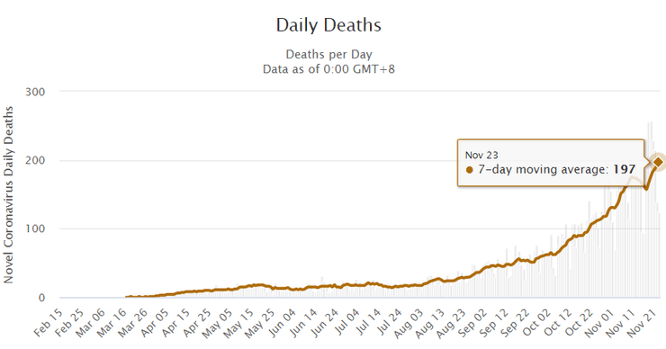 Согласно данным Worldometers, среднесуточное количество смертей за семь дней составило 197.