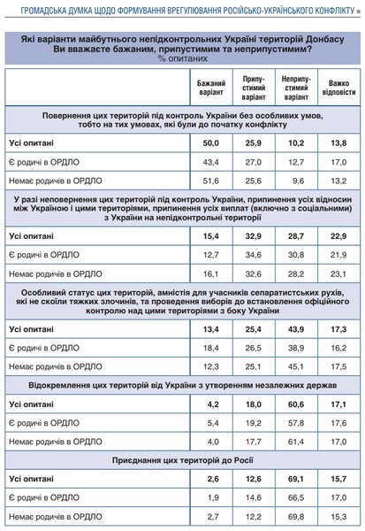Кроме того, предоставление Донбассу особого статуса, амнистии и новых выборов до установления Украиной контроля над этими территориями поддержало 32,3% среди тех, у кого есть родственники в ОРДЛО и 22% из тех, у кого там родственников нет.