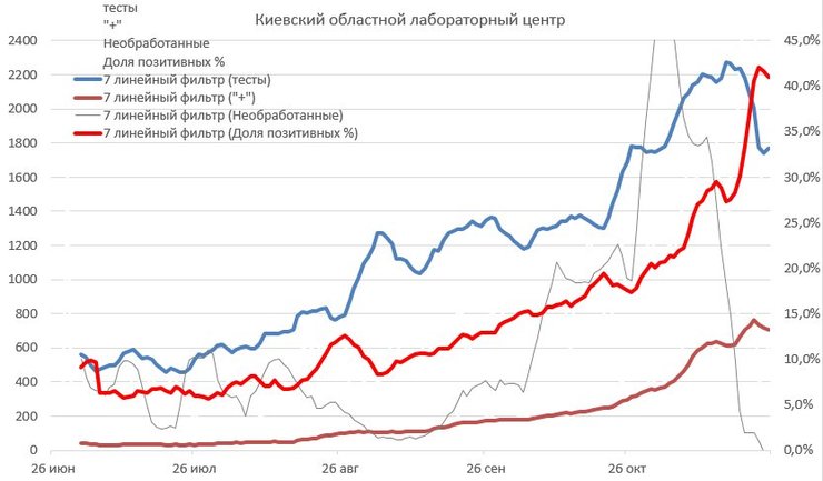 Позитивность в Киевской области за две недели взлетела в 1,5 раза и на сегодня составляет 41%.
