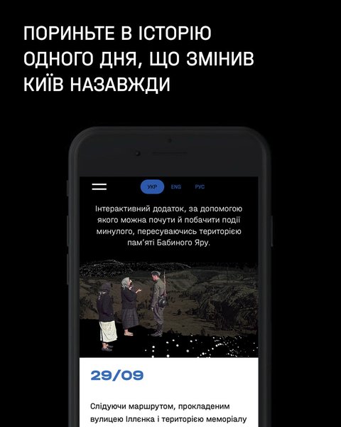 В аудиоспектакле используется технология AR. Картины прошлого появляются в дополненной реальности. Современные улицы и парк меняются, и вы видите Киев сентября 1941-го.