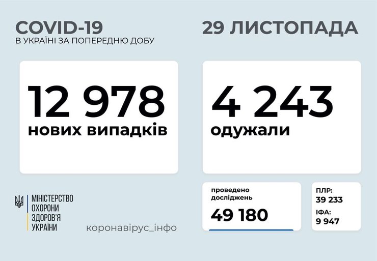 По состоянию на утро 29 ноября 2020 года в Украине зафиксировано 12 978 новых случаев коронавирусной болезни Covid-19. В их числе – 599 детей и 408 медработников.