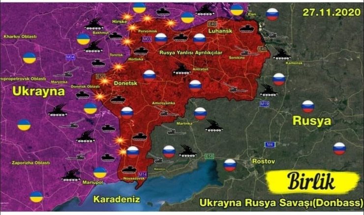 Напомним в последнее время в пророссийских и сепаратистских каналах массово появляются сообщения об активизации обстрелов с украинской стороны и переброске военной техники ВСУ к линии разграничения. Кроме того, в последнее время некоторые зарубежные СМИ публикуют ложные сведения, о наступлении Киева на Донбасс. Так российский военный журналист Юрий Котенок, выступающий на стороне сепаратистов опубликовал фейковую карту ситуции на линии разграничения, которую сейчас тиражируют азербайджанские Telegram-каналы: