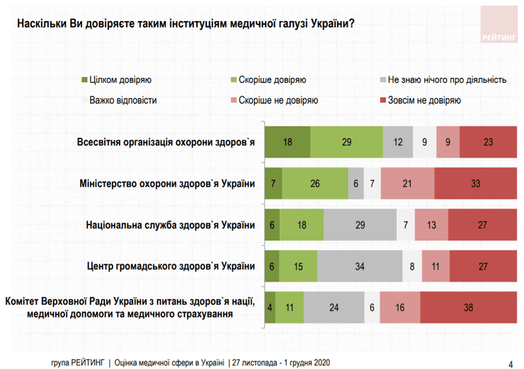 - Комитет ВРУ по вопросам здоровья нации, медицинской помощи и медицинского страхования — 15% доверяют, 54% не доверяют, 24% не знают о его деятельности.