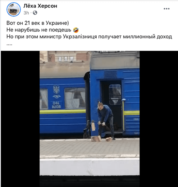 Проводник поезда "Укрзализныци" вручную рубил дрова для отопления своего вагона. Эти кадры попали на видео пользователя Facebook.