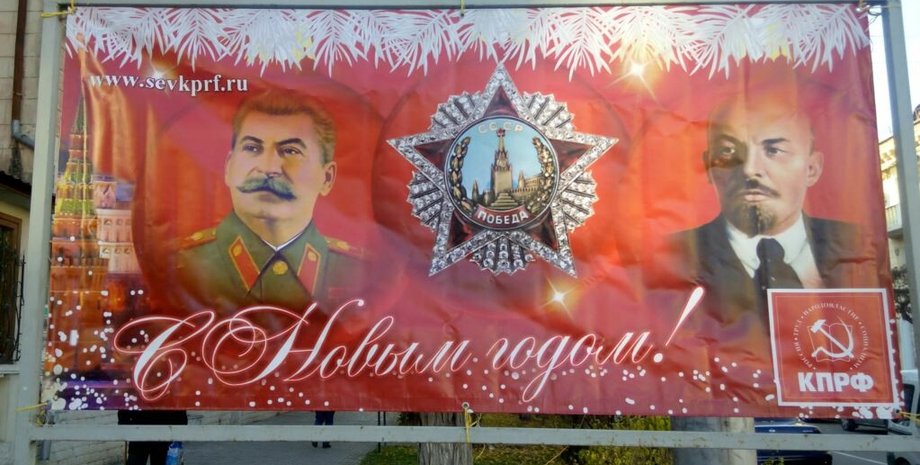 В оккупированном Россией Севастополе за три недели до Нового года появился баннер с поздравлением от Иосифа Сталина и Владимира Ленина.
