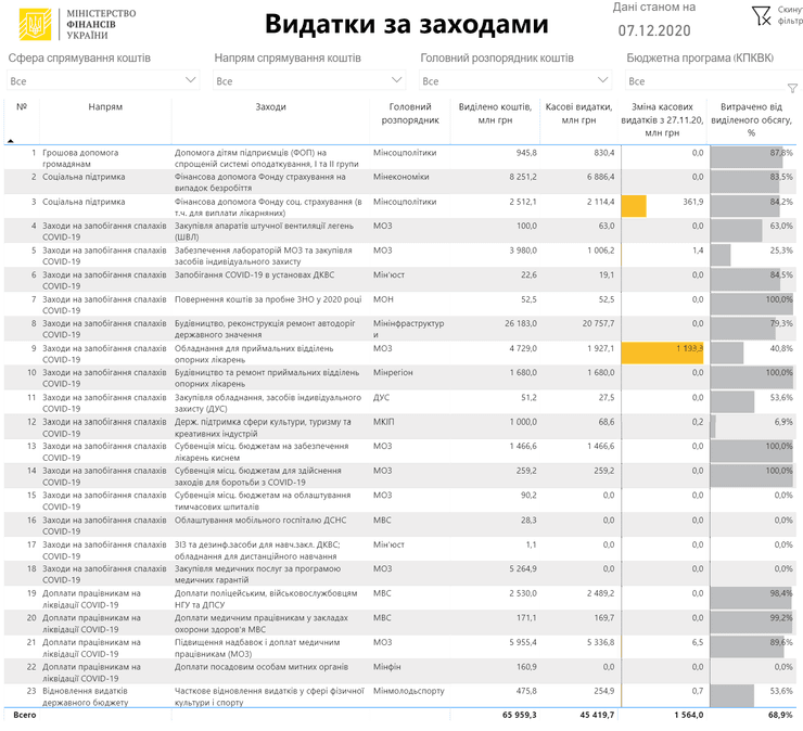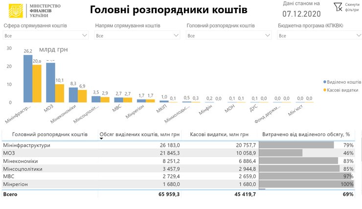 "На закупку аппаратов ИВЛ направлено 63 миллиона гривен из предусмотренных 100 млн гривен. На обеспечение лабораторий Минздрава и закупку средств индивидуальной защиты для работников учреждений здравоохранения использован 1 млрд гривен из выделенных 4 млрд грн. На субвенцию местным бюджетам для обеспечения больниц кислородом – 1,5 млрд гривен. На повышение надбавок и доплат медицинским работникам направлено 5,3 млрд грн из предусмотренных на эти цели 6 млрд гривен", – сообщается в публикации Минфина.