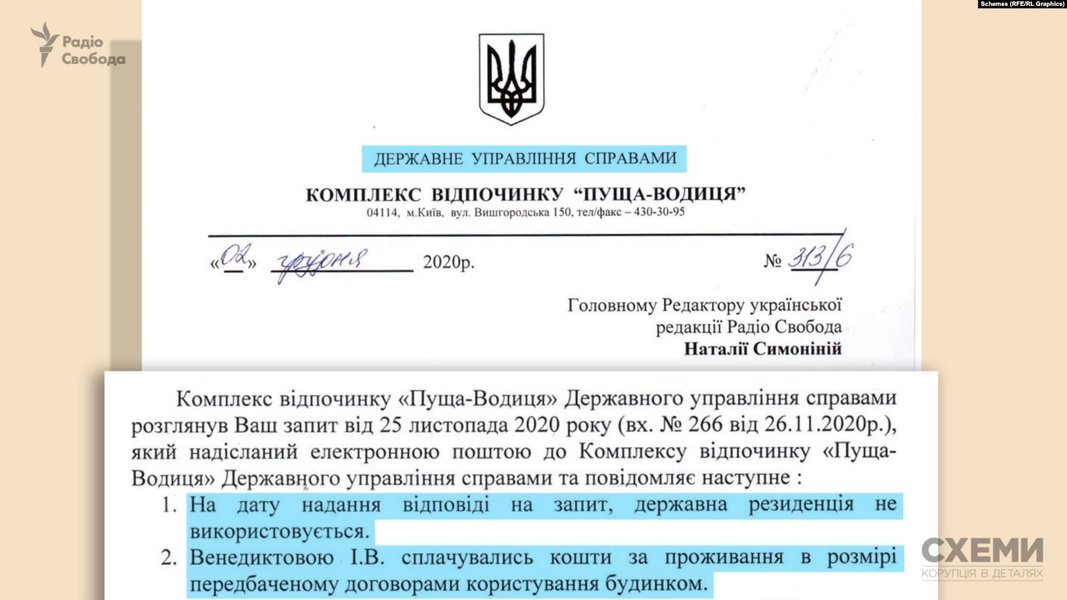 Венедиктова недоплатила за резиденцию в "Пуща-Водице", хоть и жила там по льготному тарифу – "Схемы"