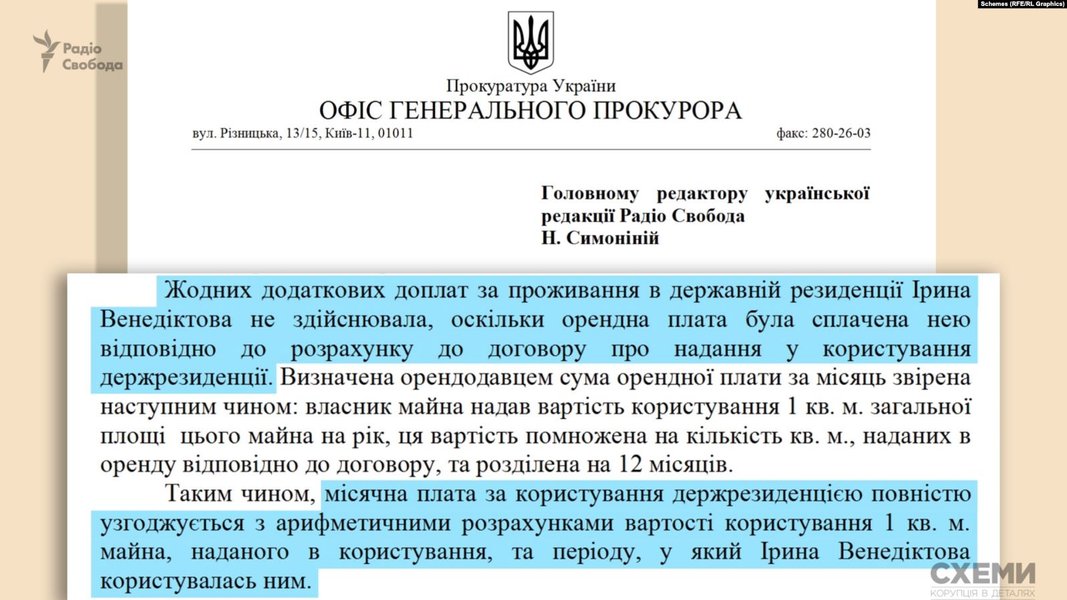В Офисе генпрокурора журналистам сообщили, что расчеты были правильными, и по их данным: "Никаких дополнительных доплат за проживание в государственной резиденции Венедиктова не осуществляла, поскольку арендная плата была уплачена в соответствии с расчетами в договоре о предоставлении в пользование госрезиденции".
