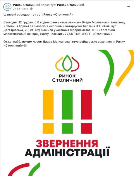 Сотрудники заявляют, что таким образом Молчанова готовит рейдерский захват. "Сегодня, 12 декабря, в выходной день, в 8:00 утра "работники" Влады Молчановой (владелицы "Столица Групп") по сговору с "черным" нотариусом Барамия Н. (Киев, Дегтяревская 28 кв.62) изменили участника предприятия ООО "Аргарний маркетинговый центр", которому принадлежит 78,5% ООО "РСХП "Столичный". Итак, в ближайшее время Влада Молчанова готовит рейдерский захват рынка "Столичный", – говорится в заявлении администрации рынка.