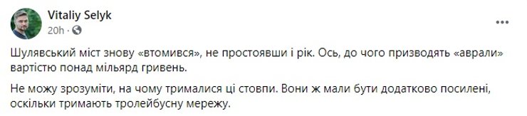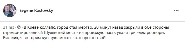 В соцсетях очередной казус с многострадальным Шулявским путепроводом обсуждали те, кому не посчастливилось оказаться рядом, без возможности изменить маршрут. Им пришлось стоять в пробках, а некоторым даже оставить машину и добираться домой в час пик альтернативным видом транспорта.