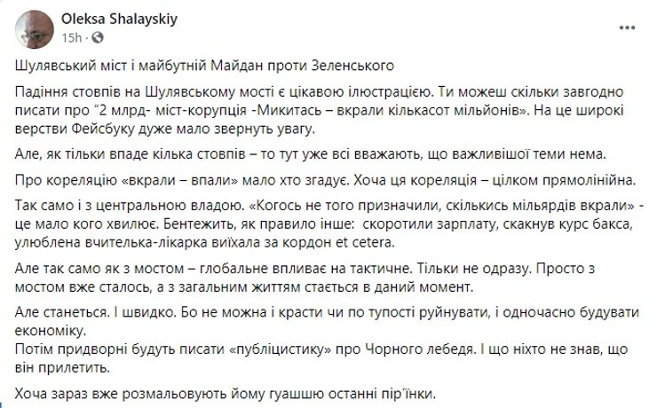 Инженер Виктор Петрук, который ранее баллотировался в мэры Киева и был автором альтернативной развязки на Шулявке, написал, что испытания Шулявского путепровода в принципе не были проведены в полной мере. Что и послужило причиной падения опор.