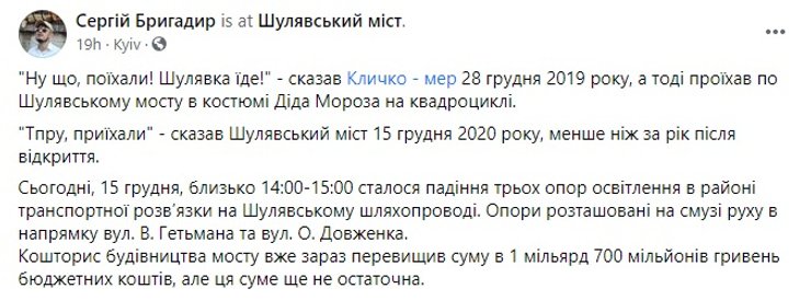 15 декабря в Киеве ознаменовалось тем, что на многострадальном Шулявском путепроводе рухнули три столба с фонарями и проводами. Теперь проблему срочно ликвидируют, а киевляне и мэр Кличко ищут виноватых