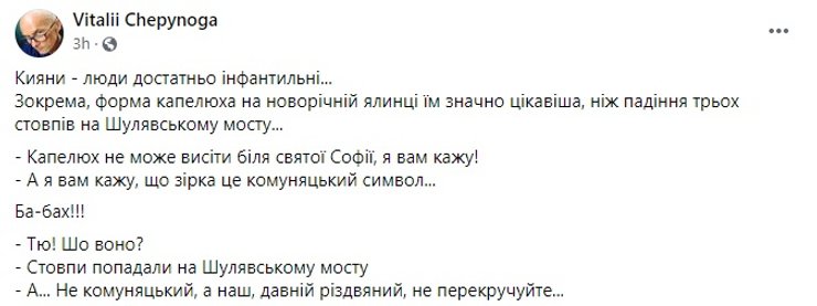 Но, как резонно отметили пользователи, скандал с не менее многострадальной киевской елкой в шляпе всколыхнул народ куда больше, нежели инцидент на мосту. Возможно, из-за того, что обошлось без человеческих жертв, падение столбов автоматически перешло в разряд "незначительных событий".