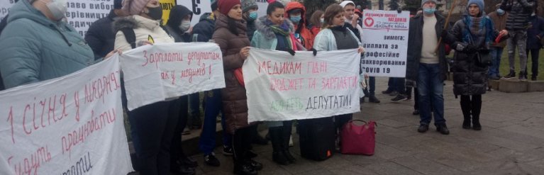 "Уже в этом году зарплата врачей должна была составлять не менее 23 тысяч гривен, для среднего медперсонала – 17 тысяч гривен и для младшего – 12 тысяч. Однако на деле медики получают втрое меньше этого", – сообщается в материале со слов собравшихся. В частности, участники протеста отмечают, что фельдшеры по Украине получают сейчас не более 5 тысяч гривен.