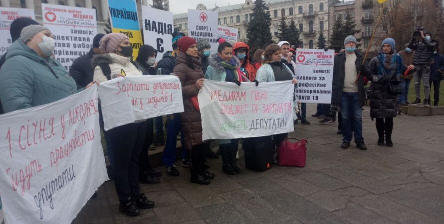 Украинские медики в среду, 16 декабря вышли на акцию протеста в Правительственном квартале Киева с призывом к Кабмину пересмотреть бюджет на 2021 год в части финансирования медицины.
