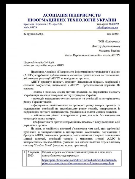 В письме на имя Дмитрия Деревицкого (основатель сети "АЛЛО"), SEO сети Максима Раскина и ООО "Цифротех" правление АПИТУ выражает озабоченность публикациями в СМИ относительно действий руководства сети "АЛЛО" и в дополнение к письму прикладывает примеры долгих и системных нарушений требований законодательства, в том числе факты продаж товаров в магазинах сети "АЛЛО" с нефискальными чеками от ФОП.