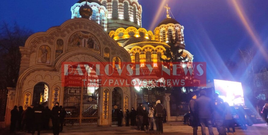 Возле собора установлен экран с онлайн-трансляцией отпевания. За ней наблюдают несколько десятков харьковчан с цветами.
