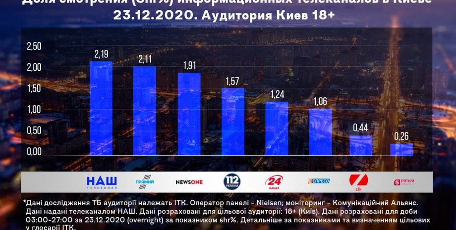 *Данные исследования ТВ-аудитории принадлежат ИТК; исследователь — Nielsen; мониторинг — Коммуникационный Альянс. Данные предоставлены телеканалом НАШ.