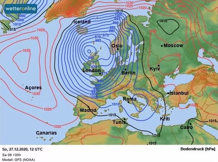 Она отмечает, что мощная циклоничность с осадками и штормовым ветром расположится над Западной Европой.
