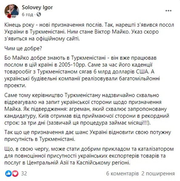 По информации руководителя "Агентства международных исследований" Игоря Соловья, туркменская сторона в рекордные сроки одобрила кандидатуру Майко. Агреман был подписан всего за три дня, хотя обычно эта процедура занимает около месяца.