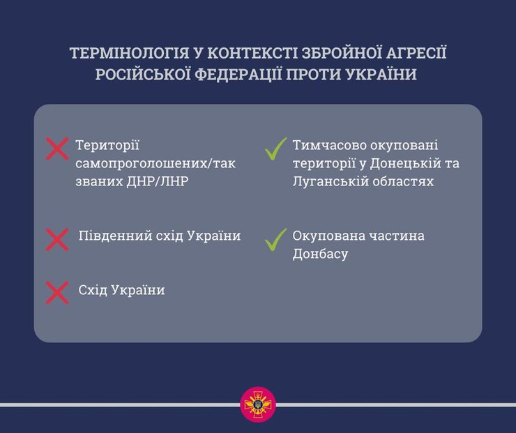 Поэтому в управлении называют два правильных термина, которыми необходимо называть события – "временно оккупированные территории в Донецкой и Луганской областях" и "оккупированная часть Донбасса".