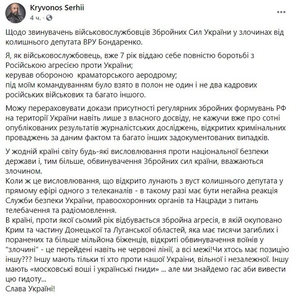 Экс-заместитель секретаря СНБО, генерал-майор Сергей Кривонос на своей странице в Facebook отреагировал на слова экс-депутата "Партии регионов" Елены Бондаренко, которая обвинила украинских военных в преступлениях против народа Донбасса.