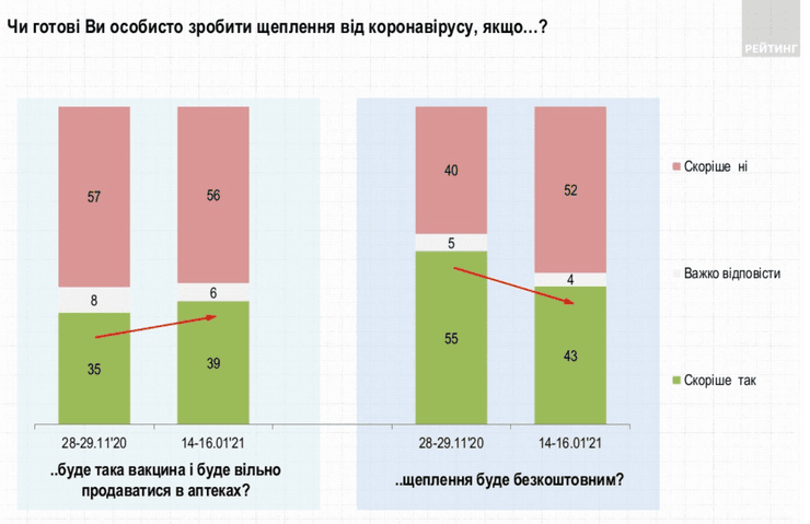 Если вакцина будет бесплатной, то 52% опрошенных не будут вакцинироваться, если же вакцину можно будет купить в аптеке и провакцинироваться за свои деньги, то 56% людей не планируют это делать. Отмечается, что в конце ноября процент людей, которые готовы были привиться от коронавируса было 55% за счет государства и 36% за свой счет.