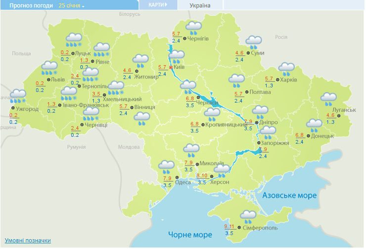"Погодные условия приведут к нарушению энергообеспечения отдельных населенных пунктов на Правобережье Украины, в западных областях также и к нарушению движения автомобильного транспорта на отдельных участках дорог и улиц", — сказано в сообщении.