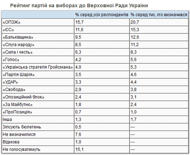 На грани прохождения в парламент находится Партия Шария (4,6%), УДАР (4,4%) и Свобода (3,8%) и Опозиционный блок (3,1%). Остальные партии не набирают и трех процентов.