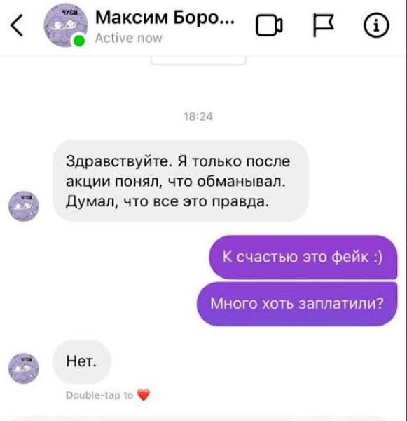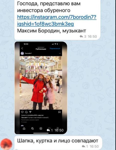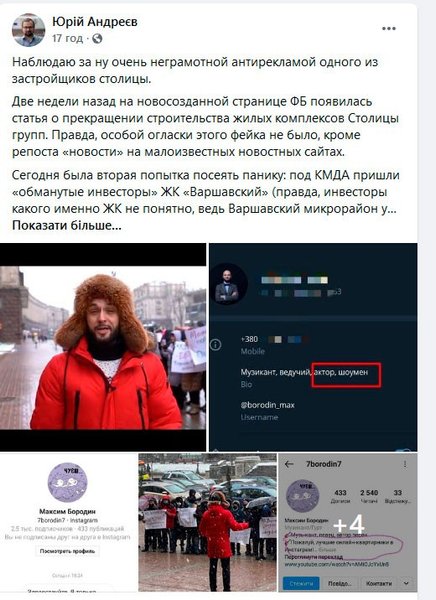 "Собственно, о каких-то проблемах у ЖК "Варшавский" никто до этого никогда не слышал. Часть домов уже давно сданы, а на тех, что строятся, работы всегда велись по плану и все графики выдерживались. Поэтому мы были немало удивлены этой "акцией" и в своей закрытой группе решили найти человека, больше всего разорявшегося на камеру. Его быстро узнали благодаря профилю в "Инстаграм". Это оказался "музыкант и певец", а также "актер и шоумен" Максим Бородин. Правда, после того, как мы с ним связались, его странички в соцсетях почему-то очень быстро ликвидировались. Впрочем, остались скрины. В том числе и переписки с ним, где он признается в обмане", — рассказал в телефонном комментарии "Апострофу" один из настоящих инвесторов по имени Сергей.