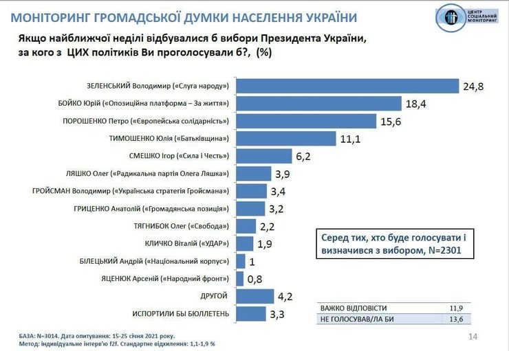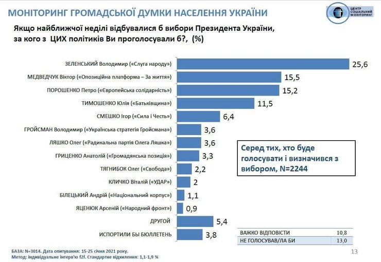 По его мнению, при формулировании этого вопроса социологи наконец-то удержались от того, чтобы перечислять всех потенциальных кандидатов на президентство в одном и том же списке: "Такую ошибку недавно допускали даже такие известные компании как КМИС и "Деминициативы". Ошибка такого подхода в том, что если от одной партии в таком списке фигурирует сразу несколько человек, то результаты такого опроса, очевидно, являются необъективными. В самом деле, от партии на выборах идет только один кандидат. Он условно получает все голоса сторонников такой партии. А если в списке у социологов такой кандидат не один, то и голоса респондентов будут дробиться. В итоге, результатам таких опросов верить нельзя. В свою очередь, "Социальный мониторинг" поступил мудрее, разводя представителей одной партии по разным вариантам списка.