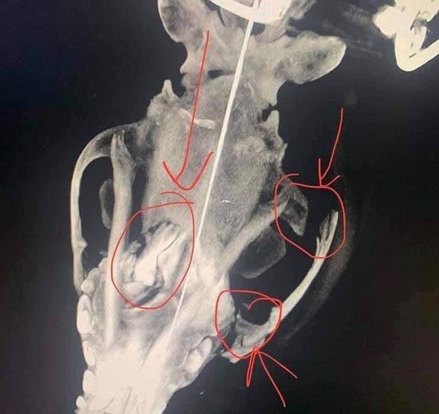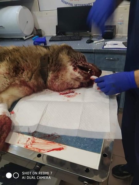 Состояние собаки крайне тяжелое, у нее раздроблена челюсть, множественные переломы костей, и проблемы со зрением. Врачи ввели собаку в искусственную кому. Прогнозы неутешительные. На реабилитацию собаки может уйти от 6 месяцев до двух лет.