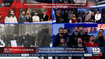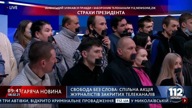 В студиях телеканалов "112 Украина", NewsOne и ZIK ведущие и съемочные группы появились в эфире с заклеенными ртами, что символизирует ограничение свободы слова в Украине.