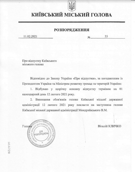 Киевский городской голова взял отдых на один день – пятницу, 12 февраля. Исполнять его обязанности будет его заместитель – Валентин Мондриевский.