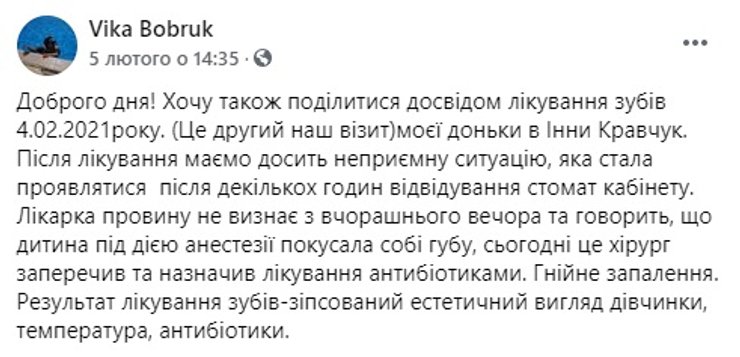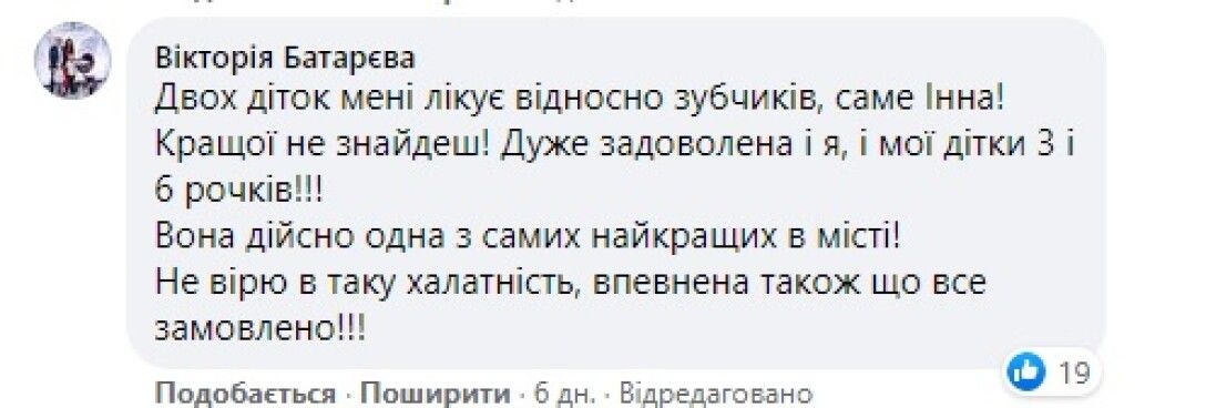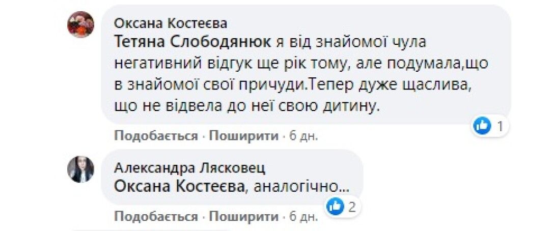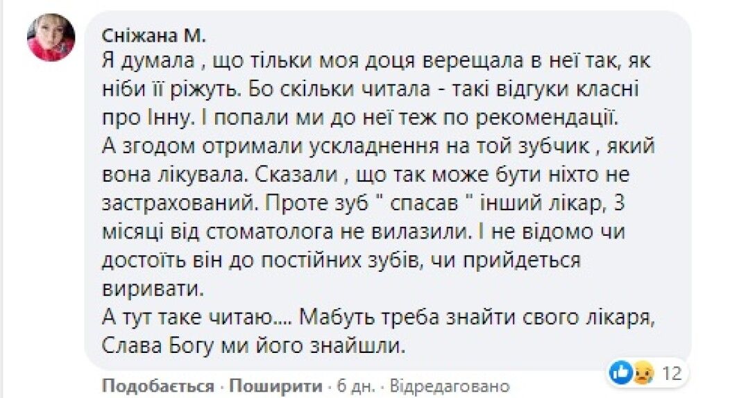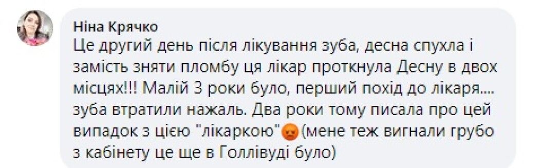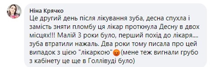 Под постом появились сообщения от других клиентов стоматолога Инны Кравчук. Некоторые подтверждали оригинальный пост, вспоминая подобные случаи и упоминая, что дети кричали в кабинете и позже им пришлось сменить врача.