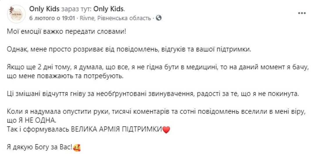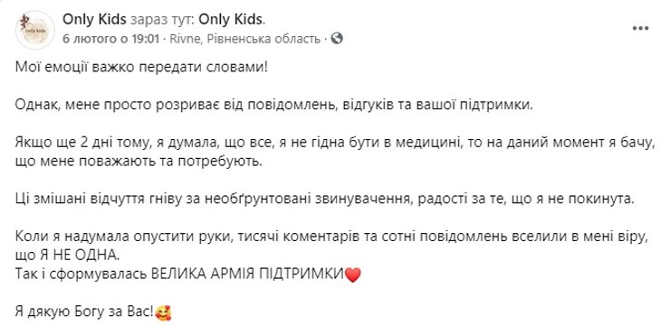 Женщина написала пост, в котором отметила, что была не в курсе разгоревшегося скандала, потому что находилась за границей без доступа к Интернету. Однако сообщила, что некоторое время назад "расстались" с Инной Кравчук именно из-за ее отношения к маленьким пациентам.